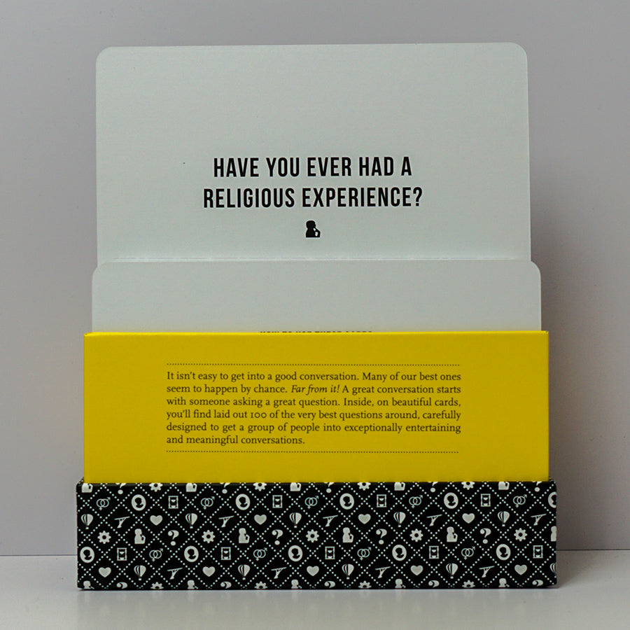 In this set of beautiful cards, you’ll find laid out 100 of the very best questions around, carefully designed to get a group of people into exceptionally entertaining and meaningful conversations.