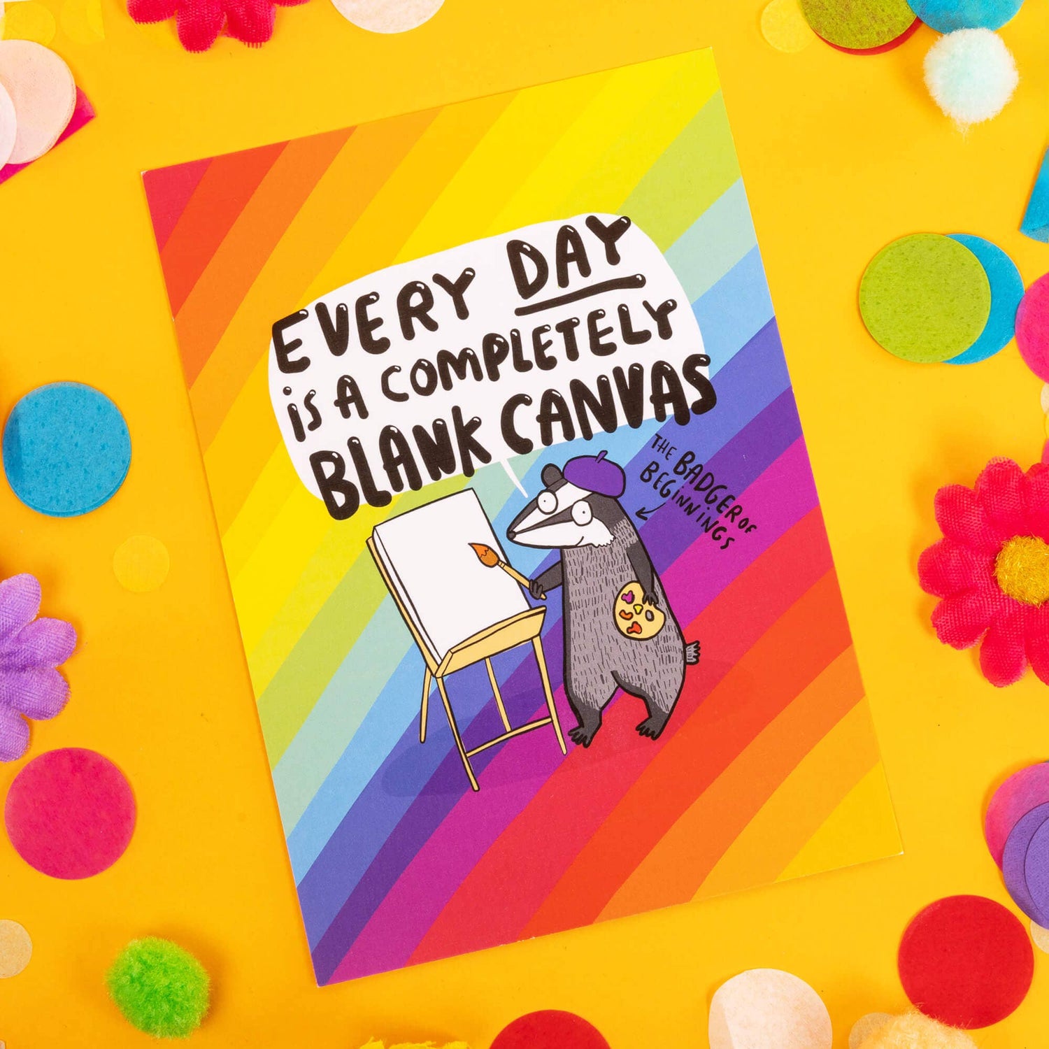 This badger is here to remind you that Every Day Is A Completely Blank Canvas. Get those paints out and make your own day! Ideal to frame up as a gift :) * Illustrated by Katie Abey * A6 Postcard size * Printed on 350gsm stock with a silk finish * Reverse has space for address and a stamp * A6 in size *