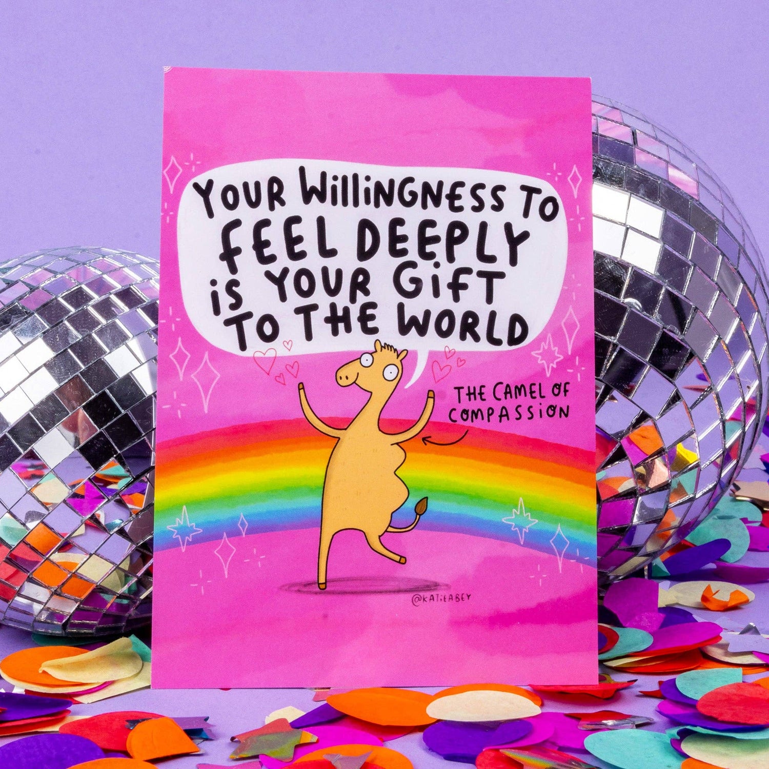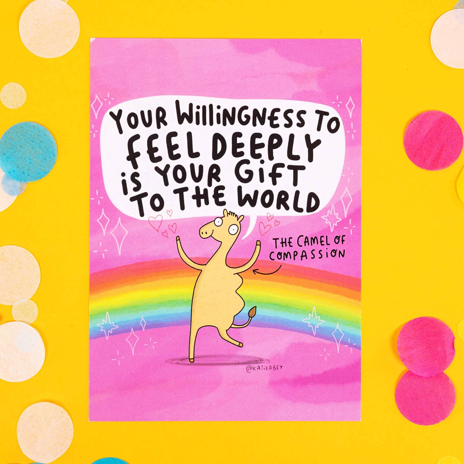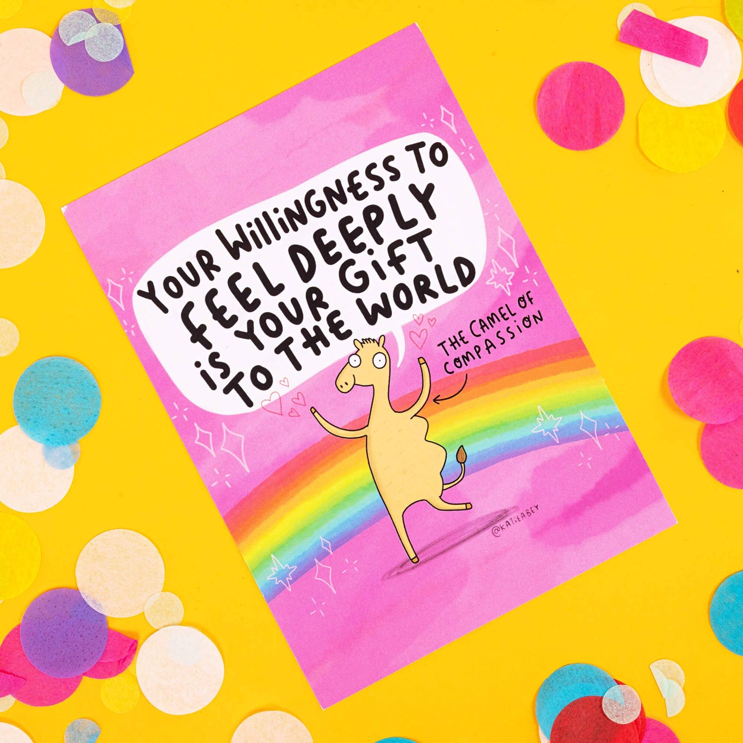 This super-sweet “Camel of Compassion A6 Postcard” is guaranteed to make your day. With its whimsical illustration, it’s the perfect gift for yourself or that special someone. * Illustrated by Katie Abey * A6 Postcard size * Printed on 350gsm stock with a silk finish * Reverse has space for address and a stamp * Sold as a set of 5 * A6 in size *