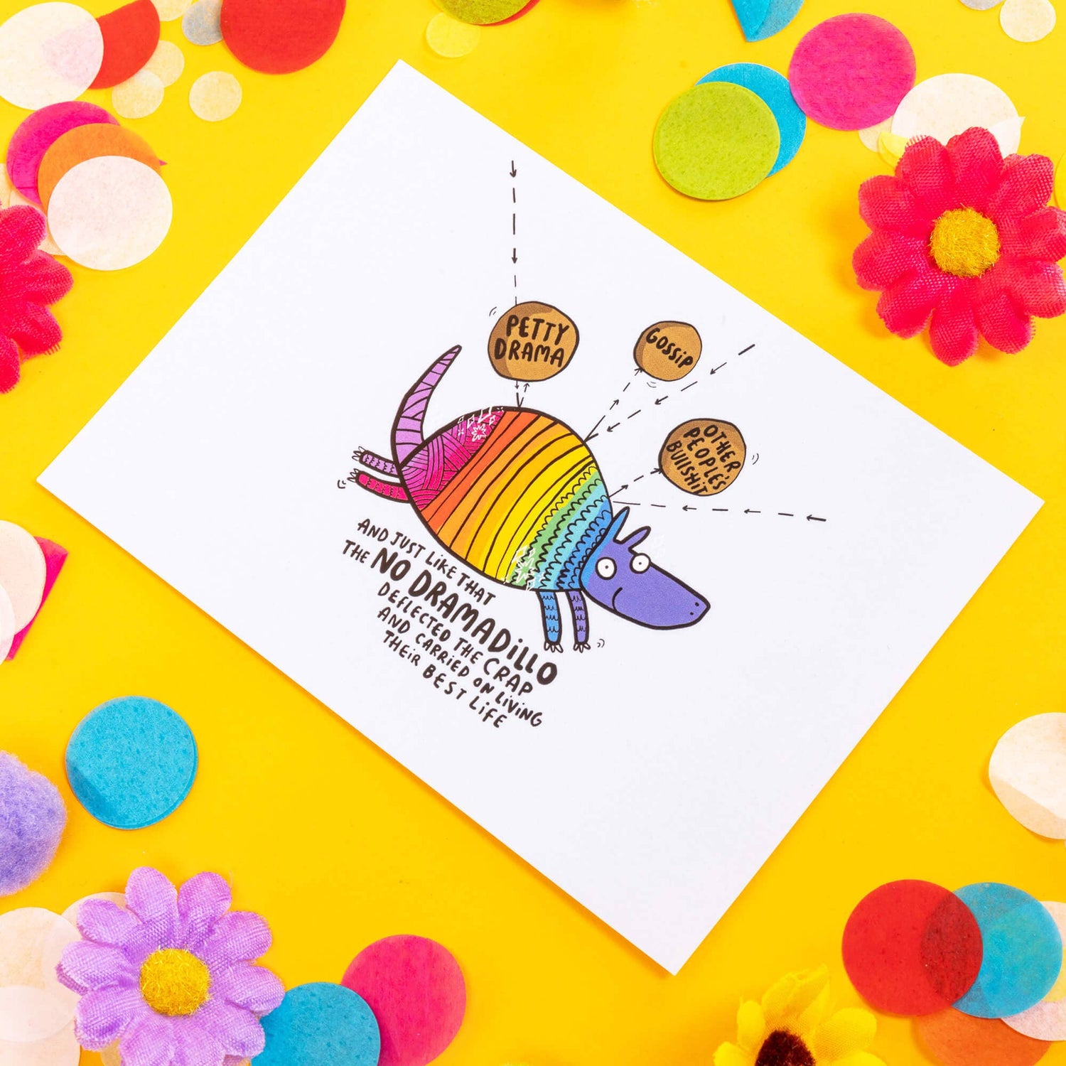 Need to deflect the Crappy drama created by pathetic nobodies. The Dramadillo is here to help you hold your boundaries Ideal to frame up as a gift :) * Illustrated by Katie Abey * A6 Postcard size * Printed on 300gsm stock with a silk finish * Reverse has space for address and a stamp * A6 in size *