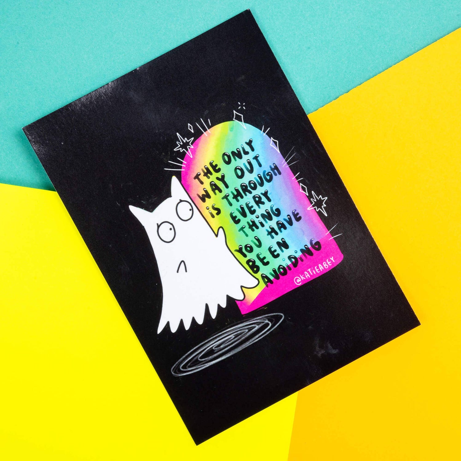 Send a spooky message with The Ghost Of Non Avoidance A6 Postcard illustrated by Katie Abey. Perfect for Halloween or for those who try to avoid. (Ghost puns not included.) * Illustrated by Katie Abey * A6 Postcard size * Printed on 300gsm stock with a silk finish * Reverse has space for address and a stamp * A6 in size *