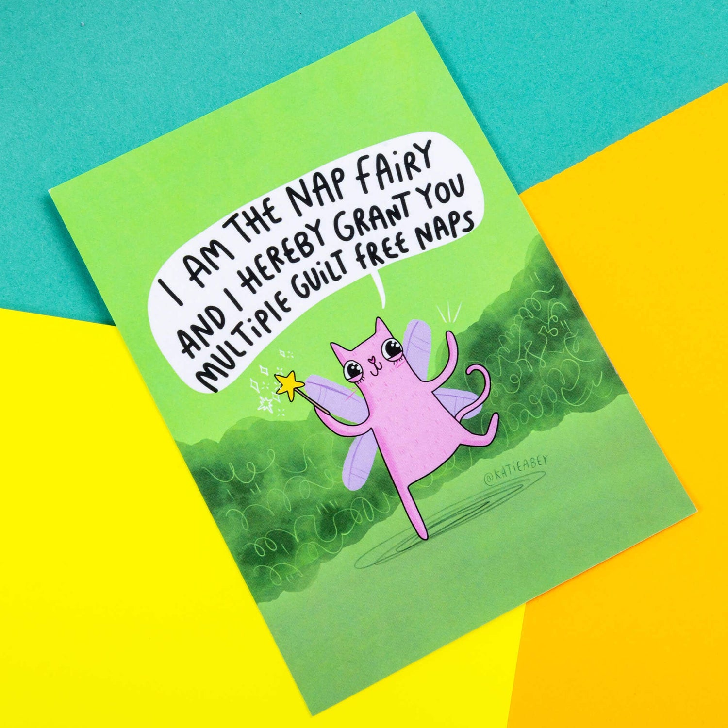 Introducing the playful Nap Fairy Cat A6 Postcard by Katie Abey. This whimsical illustration will bring a smile to your face and add a touch of humor to your day. Share it with a friend or keep it for yourself - either way, it's sure to bring some playful fun into your life! * Illustrated by Katie Abey * A6 Postcard size * Printed on 300gsm stock with a silk finish * Reverse has space for address and a stamp * A6 in size *