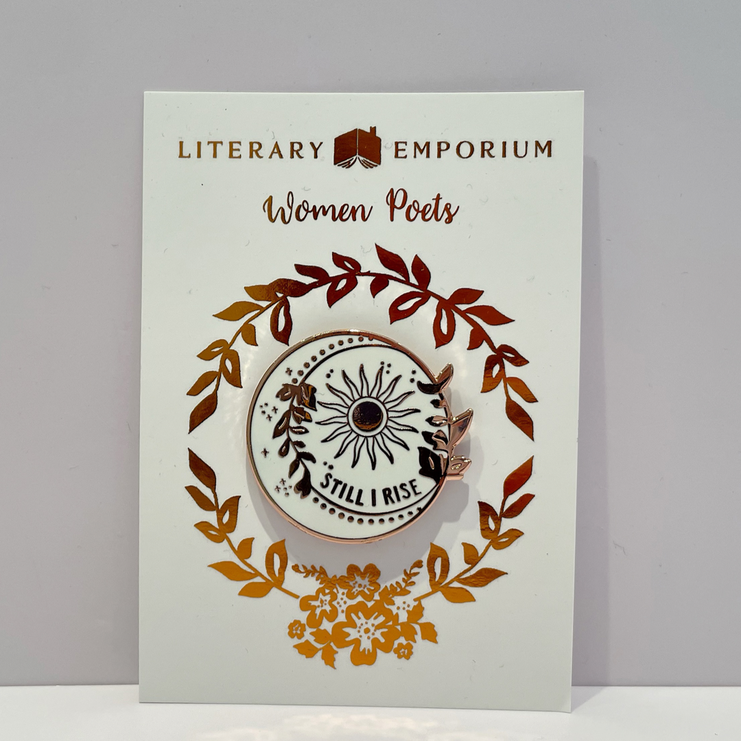 Part of our Women Poets collection, this white and rose gold enamel pin bears an intricate sun and moon design with the quote 'Still I Rise.'