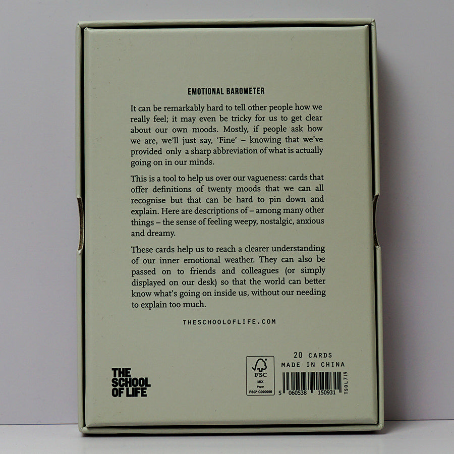 This is a tool to help us overcome our vagueness: cards that offer definitions of twenty moods that we can all recognise but that can be hard to pin down and explain. Here are descriptions of - among many other things - the sense of feeling weepy, nostalgic, anxious, and dreamy.