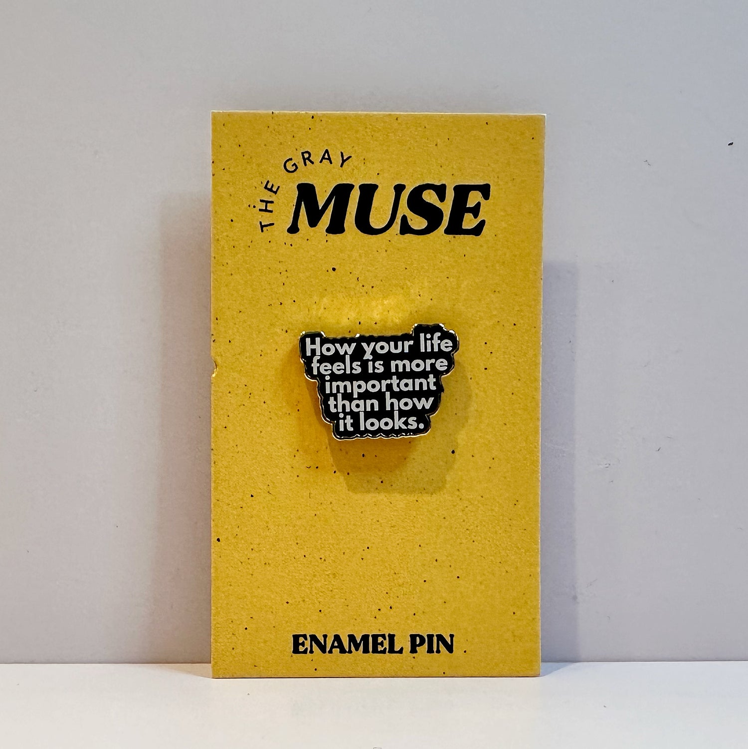 A reminder not to judge anyone's life, including your own. It's more important how one feels inside, and vanity metrics are never a good indicator of someone's true feelings. Text is screen printed and reads, "How your life feels is more important than how it looks."